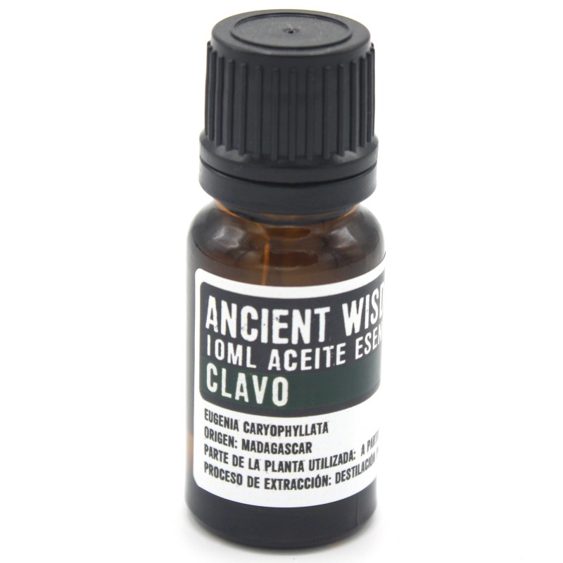 Nombre latino: Eugenia CaryophyllataParte de la planta utilizada: hojasFuente: MadagascarMétodo de extracción: destilación al vaporEl aceite de clavo se extrae generalmente por destilación al vapor de las hojas, el tallo y los brotes del árbol Eugenia caryophyllata, que es nativo de Indonesia y las islas Malacca. Este es un aceite potente con un olor cálido, fuerte y picante y debe usarse muy diluido y con mucho cuidado en aromaterapia.El aceite esencial de clavo se puede usar para curar o aliviar el acné, moretones, cortes y quemaduras, llagas en las piernas y como un analgésico para el reumatismo y la artritis. Se dice que también es bueno para el sistema digestivo, ya que ayuda con vómitos, diarrea, flatulencia, espasmos y parásitos. Se considera valioso para aliviarproblemas respiratorios como bronquitis, asma y tuberculosis. En aromaterapia, este aceite esencial estimula la mente y actúa como un afrodisíaco. Elimina el agotamiento mental y la fatiga, e induce el sueño en los insomnes.Los clavos se usaron popularmente en la antigua India y China. Se cree que la medicina china antigua usaba clavos para tratar la indigestión, diarrea, hernia, pie de atleta e infecciones fúngicas. Se ha utilizado para tratar úlceras bucales, dolor de muelas y como refrescante del aliento desde la antigüedad en estos países. Fue una de las primeras especias que se comercializaron. Se dice que los comerciantes árabes introdujeron clavos en Europa durante los días del Imperio Romano.